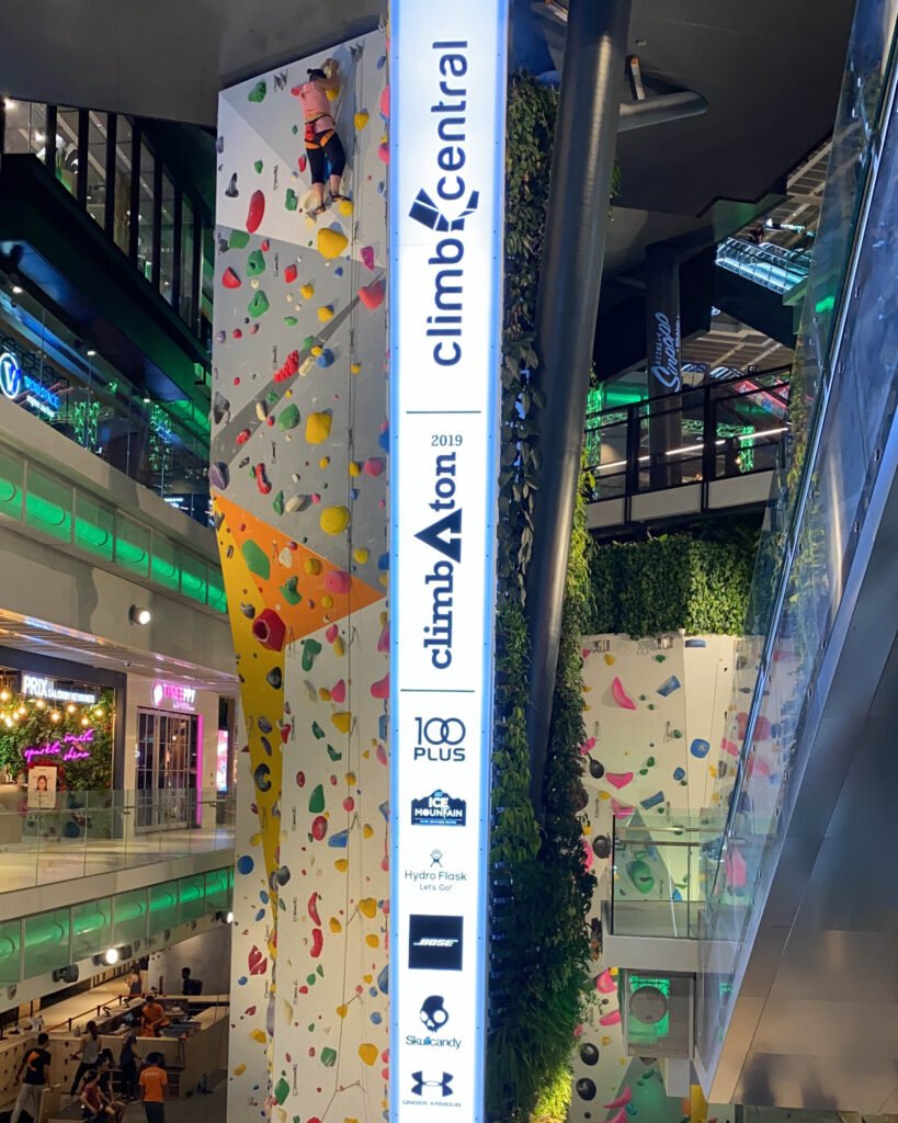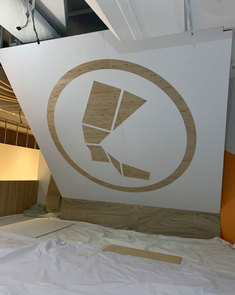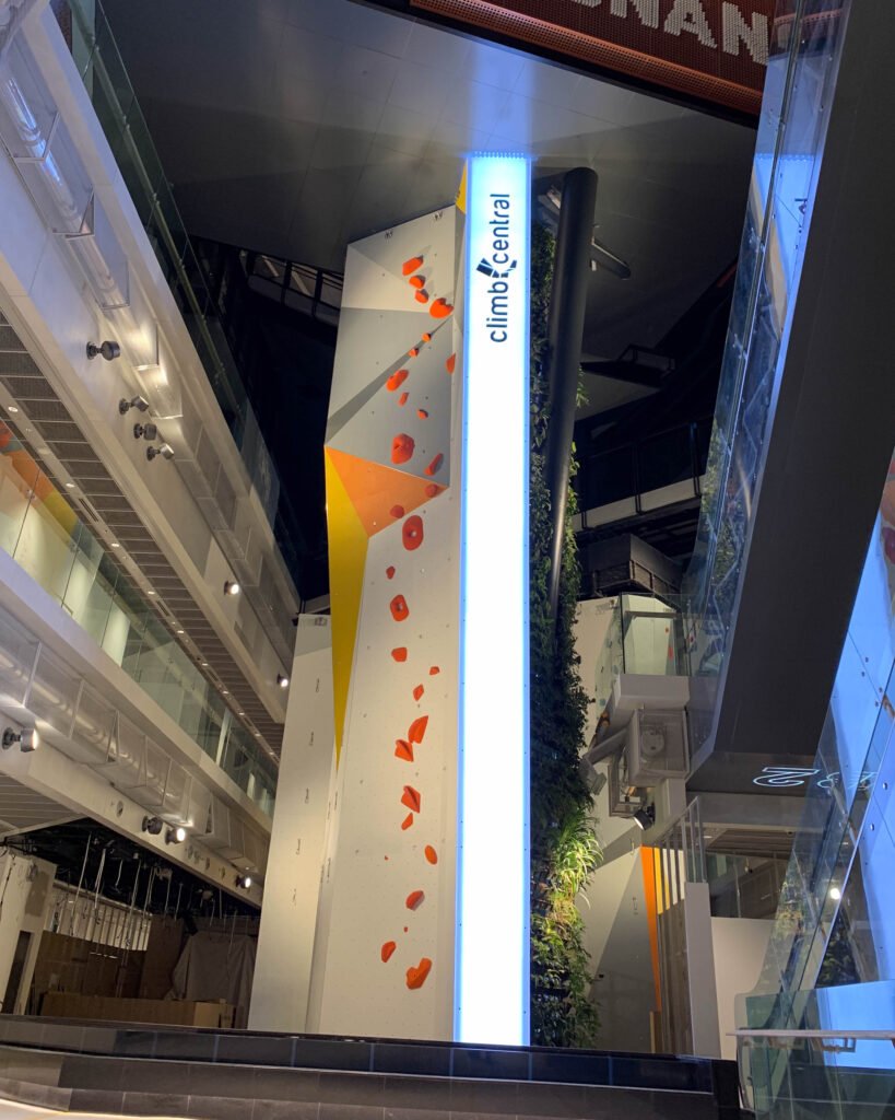 Custom-built backlit signage installed directly on the climbing wall for bold, high-visibility branding.