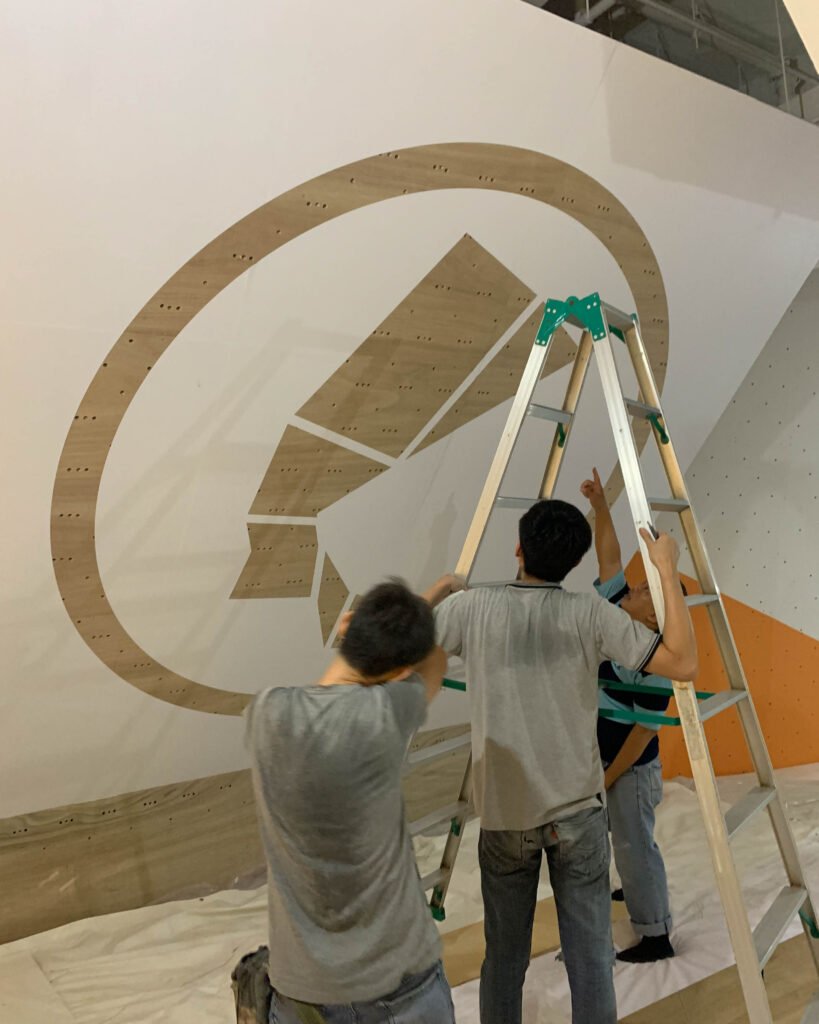 Oversized Climb Central logo painted directly onto the bouldering wall, precision-scaled and color matched to brand guides