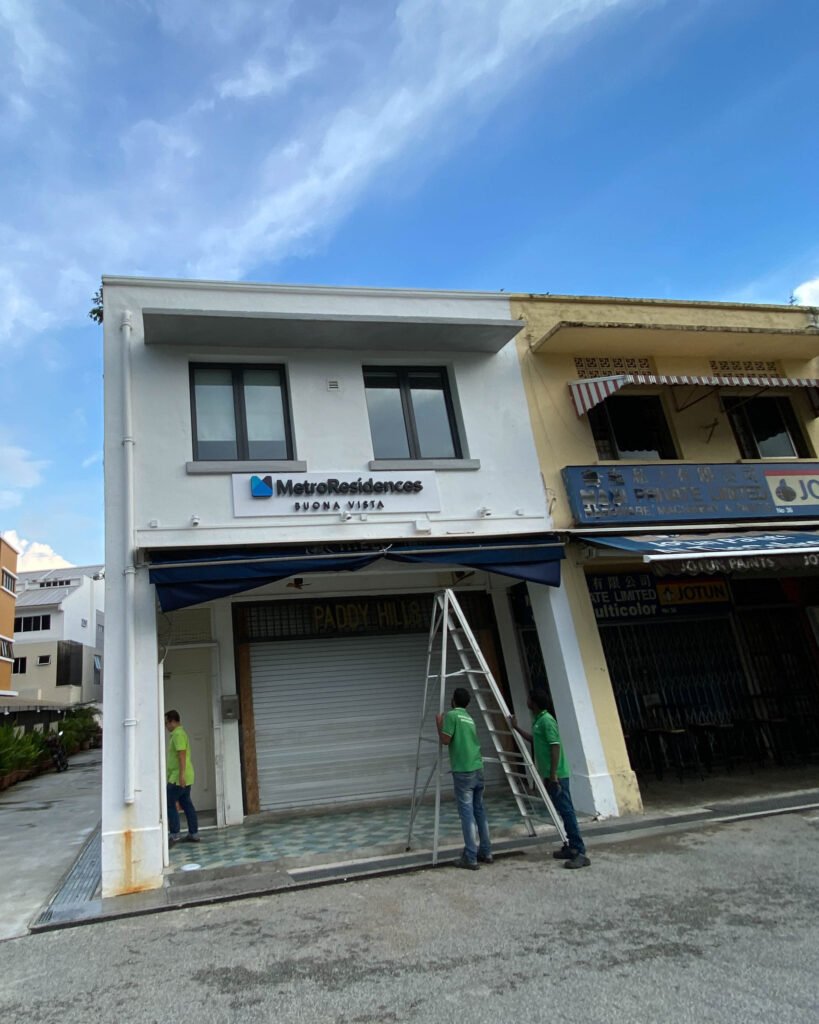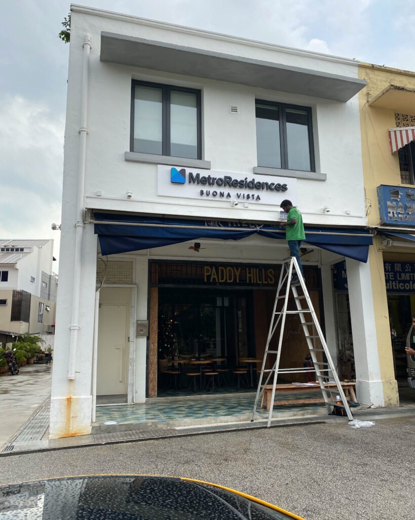 At their Buona Vista property, MetroResidences engaged us to create a custom powder-coated aluminium signboard with dimensional backlit channel letters. The signage was fabricated in-house for full quality control, then installed on-site with precision alignment and clean finish — creating strong brand presence day and night.