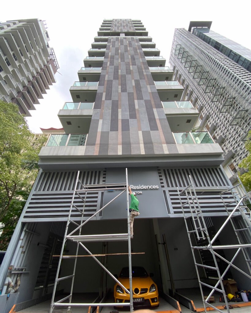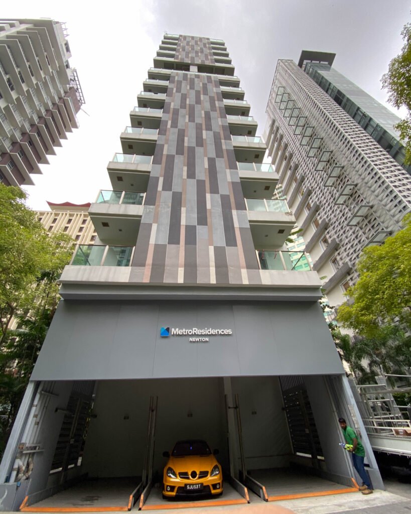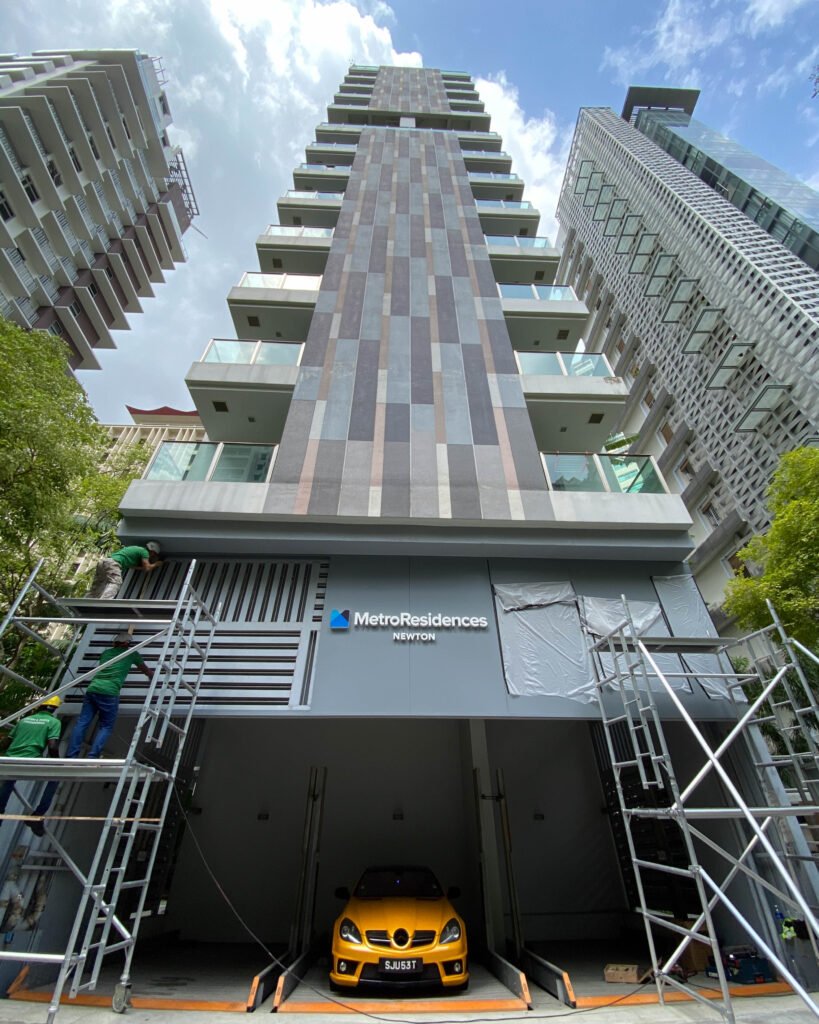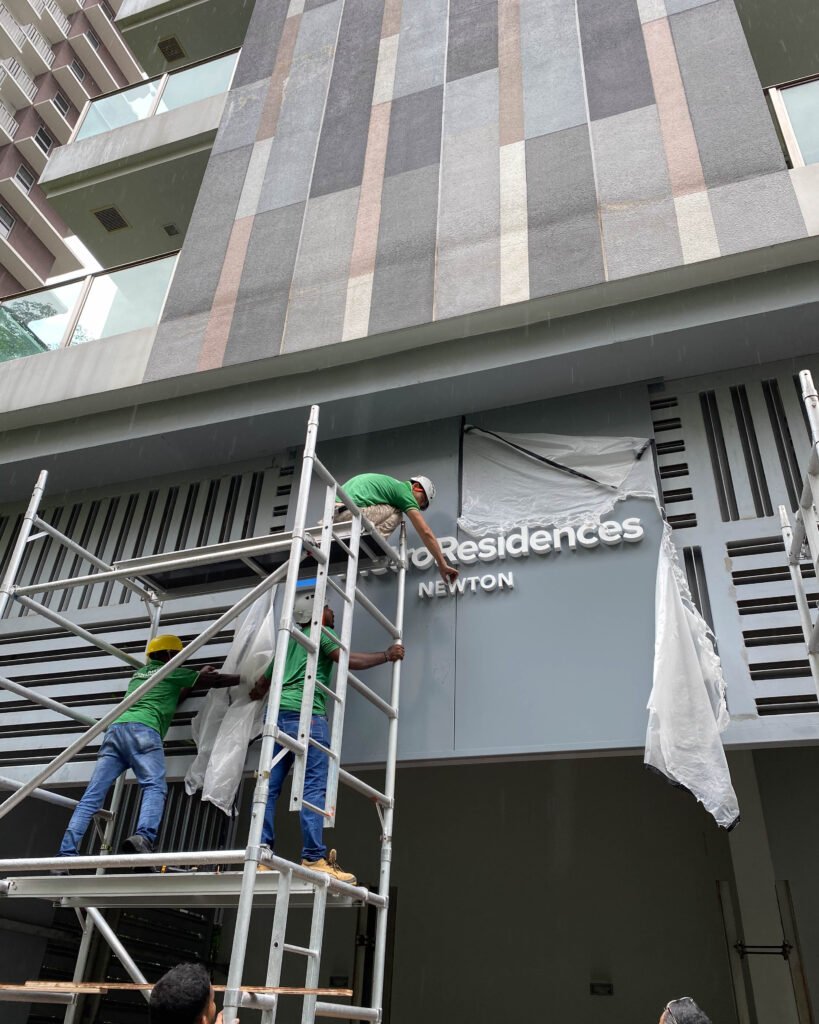 We designed and installed a sleek signage system for MetroResidences at Newton, featuring 50mm aluminium channel letters with LED backlighting mounted on a powder-coated aluminium backing panel. The frameless design and clean lighting effect added a premium look to the building’s entrance.