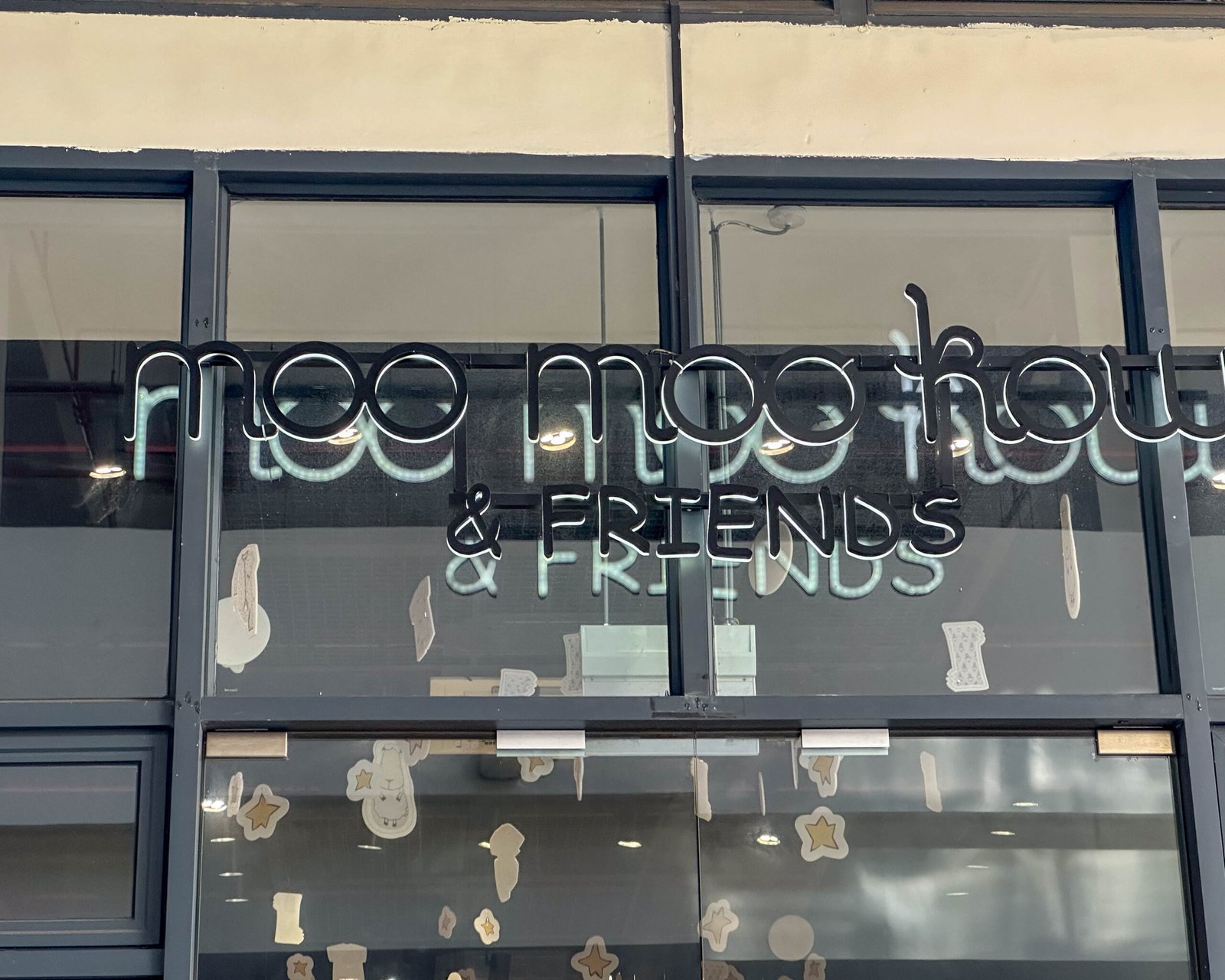 OmniBuild delivered custom pipe-mounted mini word signage and a 30mm solid acrylic backlit sign with black-painted front for Moo Moo Kow Yishun, achieving a sleek ...