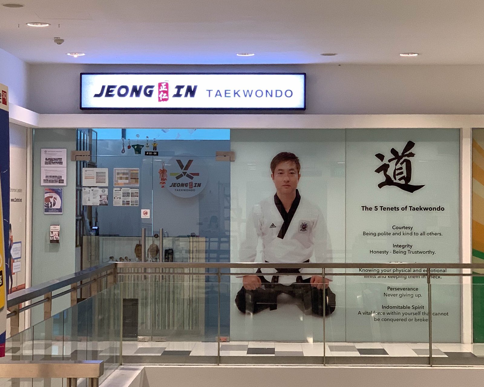 Classic lightbox signage with black powder-coated frame and 10mm spray-painted 3D acrylic letters — supplied and installed for a Taekwondo studio.